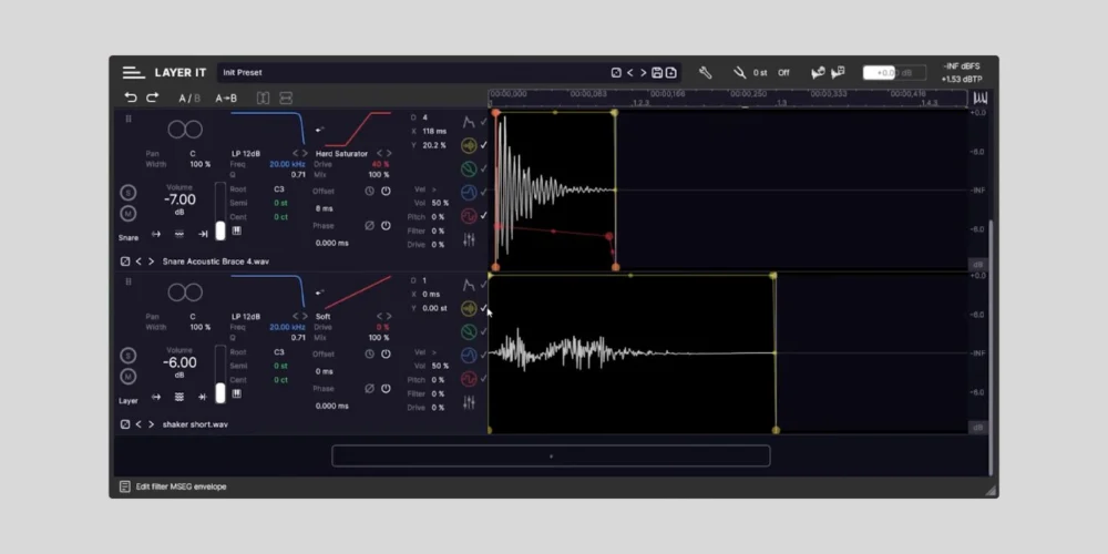 Each layer within Layer It Lite includes standard volume and pan controls, alongside multi-stage envelope generators for shaping gain, pitch, filter, and distortion. While the dedicated equalizer per layer is exclusive to the full version, these core controls still provide significant flexibility for sculpting individual sounds within the two-layer limit.
