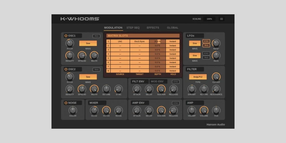 Synchronization and Interface Scalability: Practical considerations for integration into a modern DAW environment have also been addressed. Time and rate parameters throughout K-Whooms can sync to the host tempo, ensuring seamless integration with existing projects and accurate rhythmic execution of LFOs, delays, and other time-based effects. The graphical user interface (GUI) offers scalability from 100% to 200% in four distinct steps. This feature is increasingly important in contemporary production setups, accommodating various monitor sizes, resolutions, and user preferences, improving ergonomics and accessibility for producers working in diverse environments.