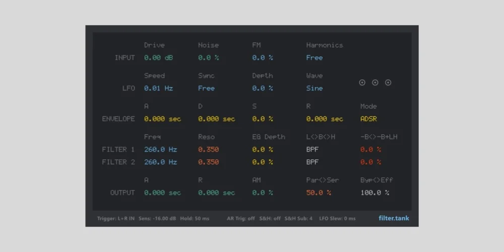 One of filter.tank’s most distinctive characteristics is its entirely text-based user interface. Unlike the prevalent graphical user interfaces featuring virtual knobs, sliders, and visualizers, filter.tank displays all parameters as numerical values – hertz for frequencies, milliseconds for times, percentages for levels, and so forth. This design choice offers both advantages and unique considerations for users.