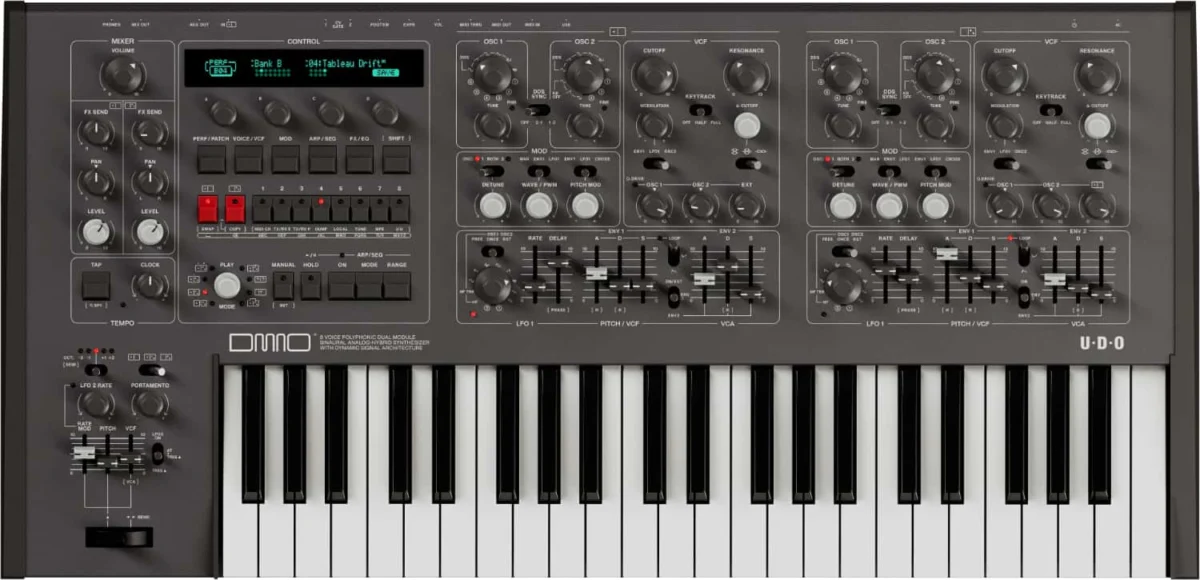 The UDO Audio DMNO is an 8-voice, 2-part multitimbral synthesizer. Its internal architecture is comprised of two independent 4-voice analog-hybrid synthesizer engines. This dual-engine design allows users to layer two distinct sounds, split the keyboard for different timbres, or treat the instrument as two separate instruments controlled via different MIDI channels.